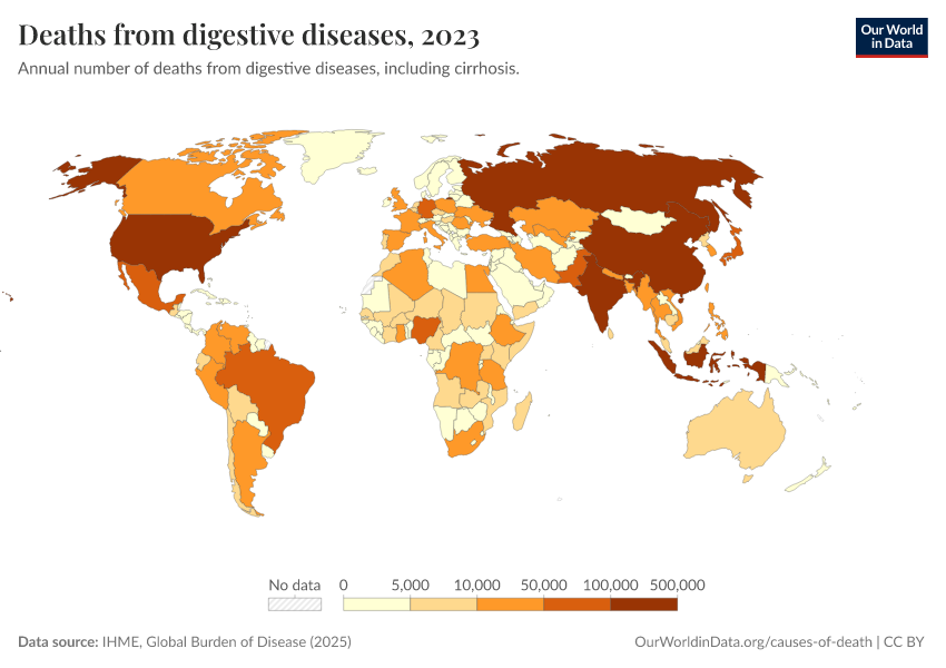 IHME, Global Burden of Disease (2025) – with major processing by Our World in Data. “Deaths from digestive diseases” [dataset]. IHME, Global Burden of Disease, “Global Burden of Disease - Deaths” [original data]. Retrieved March 1, 2026 from https://update-wdi-2026-02-27.owid.pages.dev:8789/20260211-174736/grapher/deaths-from-digestive-diseases.html (archived on February 11, 2026).