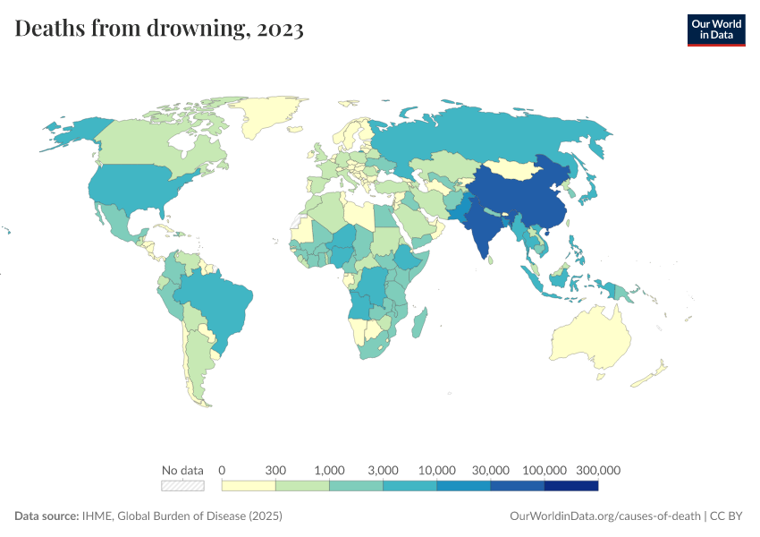 IHME, Global Burden of Disease (2025) – with major processing by Our World in Data. “Deaths from drowning” [dataset]. IHME, Global Burden of Disease, “Global Burden of Disease - Deaths” [original data]. Retrieved March 1, 2026 from https://update-wdi-2026-02-27.owid.pages.dev:8789/20260211-174736/grapher/deaths-from-drowning.html (archived on February 11, 2026).