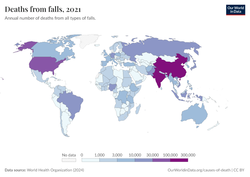World Health Organization (2024) – with major processing by Our World in Data. “Deaths from falls” [dataset]. World Health Organization, “Global Health Estimates” [original data]. Retrieved March 1, 2026 from https://update-wdi-2026-02-27.owid.pages.dev:8789/20250909-093708/grapher/deaths-from-falls.html (archived on September 9, 2025).