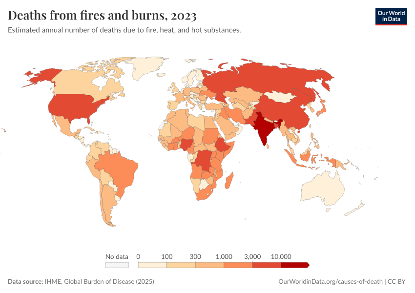 IHME, Global Burden of Disease (2025) – with major processing by Our World in Data. “Deaths from fires and burns” [dataset]. IHME, Global Burden of Disease, “Global Burden of Disease - Deaths” [original data]. Retrieved March 1, 2026 from https://update-wdi-2026-02-27.owid.pages.dev:8789/20260211-174736/grapher/deaths-from-fires-and-burns.html (archived on February 11, 2026).