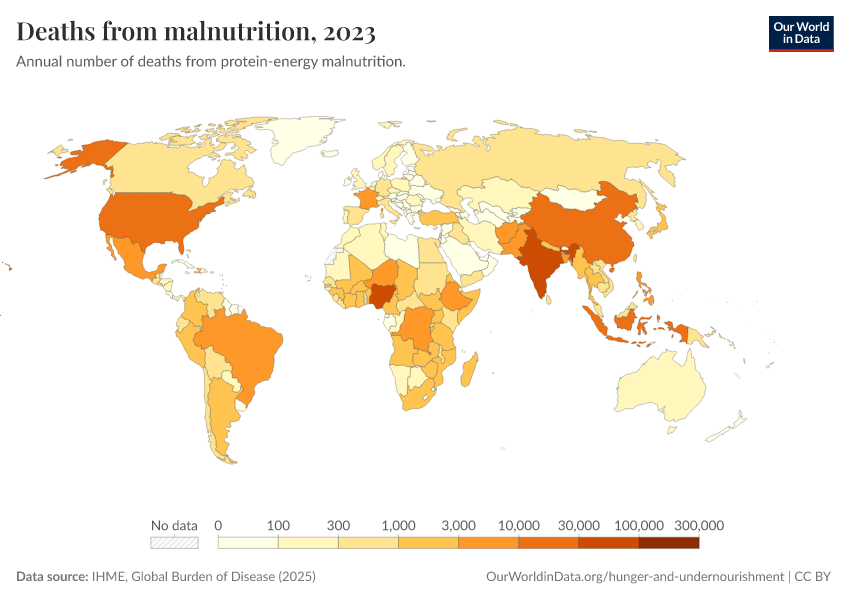 IHME, Global Burden of Disease (2025) – with major processing by Our World in Data. “Deaths from malnutrition” [dataset]. IHME, Global Burden of Disease, “Global Burden of Disease - Deaths” [original data]. Retrieved March 1, 2026 from https://update-wdi-2026-02-27.owid.pages.dev:8789/20260211-174736/grapher/deaths-from-malnutrition.html (archived on February 11, 2026).