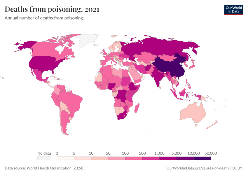 World Health Organization (2024) – with major processing by Our World in Data. “Deaths from poisoning” [dataset]. World Health Organization, “Global Health Estimates” [original data]. Retrieved March 1, 2026 from https://update-wdi-2026-02-27.owid.pages.dev:8789/20250909-093708/grapher/deaths-from-poisonings-ghe.html (archived on September 9, 2025).