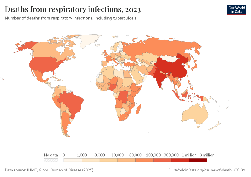 IHME, Global Burden of Disease (2025) – with major processing by Our World in Data. “Deaths from respiratory infections” [dataset]. IHME, Global Burden of Disease, “Global Burden of Disease - Deaths” [original data]. Retrieved March 1, 2026 from https://update-wdi-2026-02-27.owid.pages.dev:8789/20260211-174736/grapher/deaths-from-respiratory-infections.html (archived on February 11, 2026).