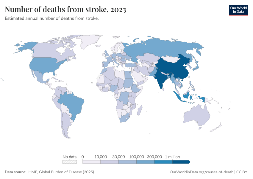 IHME, Global Burden of Disease (2025) – with major processing by Our World in Data. “Number of deaths from stroke” [dataset]. IHME, Global Burden of Disease, “Global Burden of Disease - Deaths” [original data]. Retrieved March 1, 2026 from https://update-wdi-2026-02-27.owid.pages.dev:8789/20260211-174736/grapher/deaths-from-strokes.html (archived on February 11, 2026).