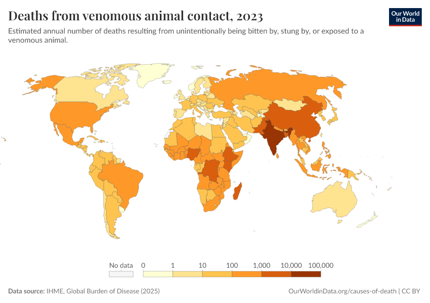 IHME, Global Burden of Disease (2025) – with major processing by Our World in Data. “Deaths from venomous animal contact” [dataset]. IHME, Global Burden of Disease, “Global Burden of Disease - Deaths” [original data]. Retrieved March 1, 2026 from https://update-wdi-2026-02-27.owid.pages.dev:8789/20260211-174736/grapher/deaths-from-venomous-animal-contact.html (archived on February 11, 2026).