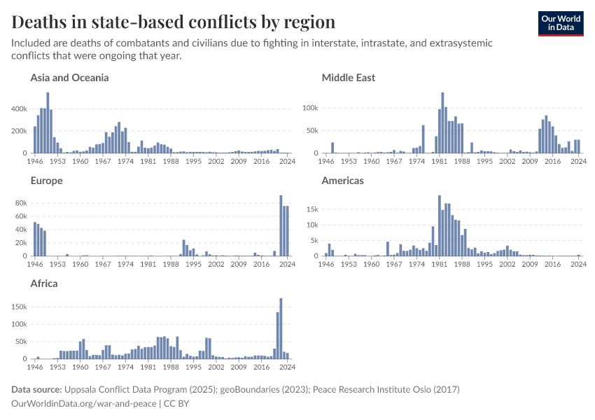 “Data Page: Deaths in state-based conflicts by region”, part of the following publication: Bastian Herre, Lucas Rodés-Guirao, and Max Roser (2024) - “War and Peace”. Data adapted from Uppsala Conflict Data Program, geoBoundaries, Peace Research Institute Oslo. Retrieved from https://update-wdi-2026-02-27.owid.pages.dev:8789/20260119-070102/grapher/deaths-in-state-based-conflicts-by-region.html [online resource] (archived on January 19, 2026).How to cite this data
