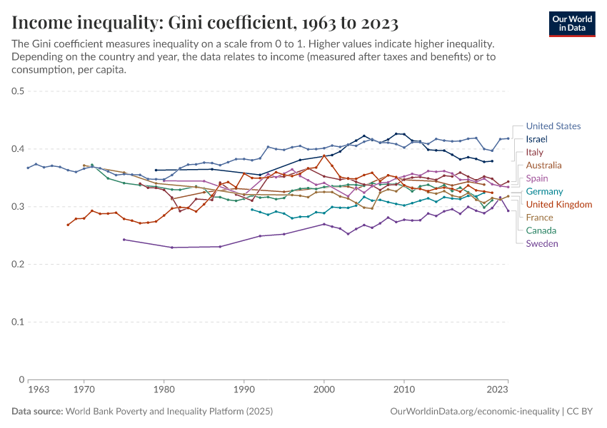 World Bank Poverty and Inequality Platform (2025) – with major processing by Our World in Data. “Income inequality: Gini coefficient – World Bank” [dataset]. World Bank Poverty and Inequality Platform, “World Bank Poverty and Inequality Platform (PIP) 20250930_2021, 20250930_2017” [original data]. Retrieved March 1, 2026 from https://update-wdi-2026-02-27.owid.pages.dev:8789/20260127-114142/grapher/economic-inequality-gini-index.html (archived on January 27, 2026).