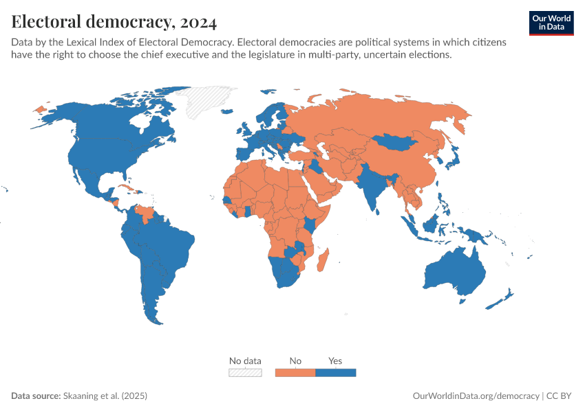 Skaaning et al. (2025) – processed by Our World in Data. “Electoral democracy” [dataset]. Skaaning et al., “Lexical Index of Electoral Democracy (LIED) v6.8” [original data]. Retrieved March 1, 2026 from https://update-wdi-2026-02-27.owid.pages.dev:8789/20260119-065148/grapher/electoral-democracy-lexical.html (archived on January 19, 2026).