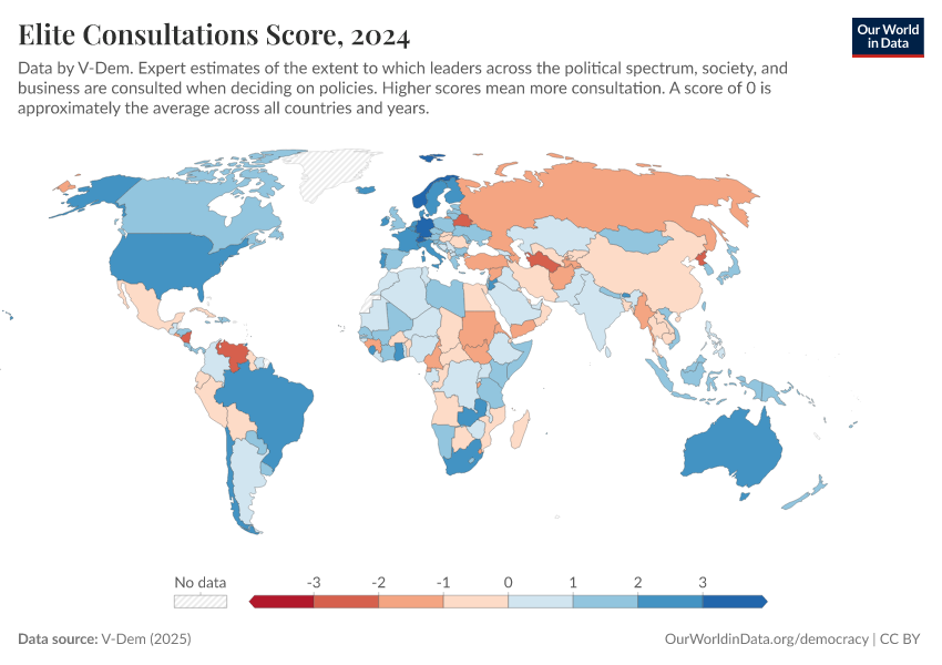 “Data Page: Elite consultation”, part of the following publication: Bastian Herre, Lucas Rodés-Guirao, and Esteban Ortiz-Ospina (2013) - “Democracy”. Data adapted from V-Dem. Retrieved from https://update-wdi-2026-02-27.owid.pages.dev:8789/20260204-170225/grapher/elite-consultations-score.html [online resource] (archived on February 4, 2026).How to cite this data