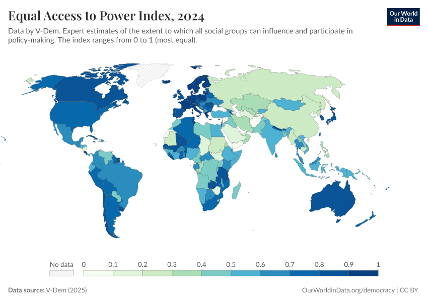 V-Dem (2025) – processed by Our World in Data. “Equal access to power index – V-Dem” [dataset]. V-Dem, “Democracy report v15” [original data]. Retrieved March 1, 2026 from https://update-wdi-2026-02-27.owid.pages.dev:8789/20260119-070102/grapher/equal-access-to-power-index.html (archived on January 19, 2026).