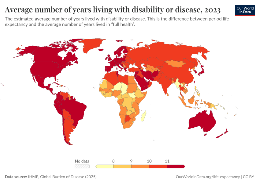“Data Page: Average number of years living with disability or disease”, part of the following publication: Saloni Dattani, Lucas Rodés-Guirao, Hannah Ritchie, Esteban Ortiz-Ospina, and Max Roser (2023) - “Life Expectancy”. Data adapted from IHME, Global Burden of Disease. Retrieved from https://update-wdi-2026-02-27.owid.pages.dev:8789/20260213-171235/grapher/expected-years-of-living-with-disability-or-disease-burden.html [online resource] (archived on February 13, 2026).How to cite this data