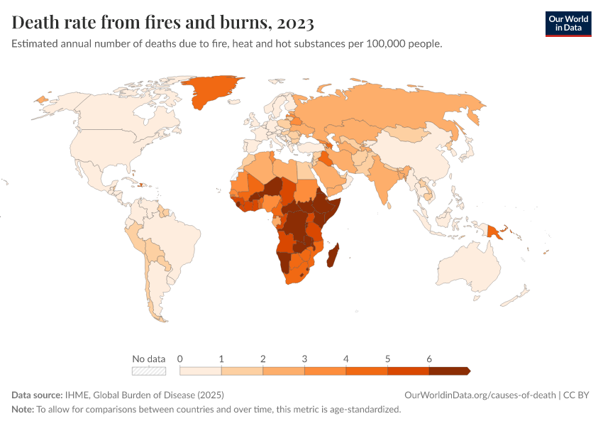 IHME, Global Burden of Disease (2025) – with major processing by Our World in Data. “Death rate from fires and burns” [dataset]. IHME, Global Burden of Disease, “Global Burden of Disease - Deaths” [original data]. Retrieved March 1, 2026 from https://update-wdi-2026-02-27.owid.pages.dev:8789/20260211-173942/grapher/fire-death-rates.html (archived on February 11, 2026).