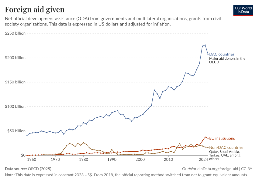 OECD (2025) – with major processing by Our World in Data. “Foreign aid given – Net disbursements” [dataset]. OECD, “OECD Official Development Assistance (ODA) - DAC1: Flows by provider (ODA+OOF+Private)”; OECD, “OECD Official Development Assistance (ODA) - DAC2A: Aid (ODA) disbursements to countries and regions” [original data]. Retrieved March 1, 2026 from https://update-wdi-2026-02-27.owid.pages.dev:8789/20260223-070107/grapher/foreign-aid-given-net.html (archived on February 23, 2026).