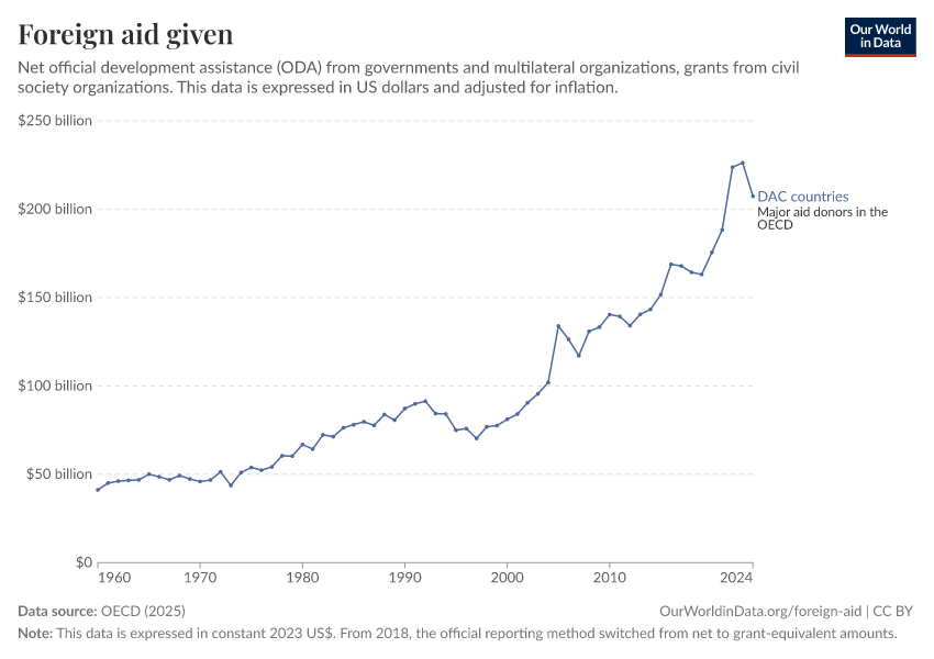 OECD (2025) – with major processing by Our World in Data. “Foreign aid given – Net disbursements” [dataset]. OECD, “OECD Official Development Assistance (ODA) - DAC1: Flows by provider (ODA+OOF+Private)”; OECD, “OECD Official Development Assistance (ODA) - DAC2A: Aid (ODA) disbursements to countries and regions” [original data]. Retrieved March 1, 2026 from https://update-wdi-2026-02-27.owid.pages.dev:8789/20260223-070107/grapher/foreign-aid-given-net.html (archived on February 23, 2026).