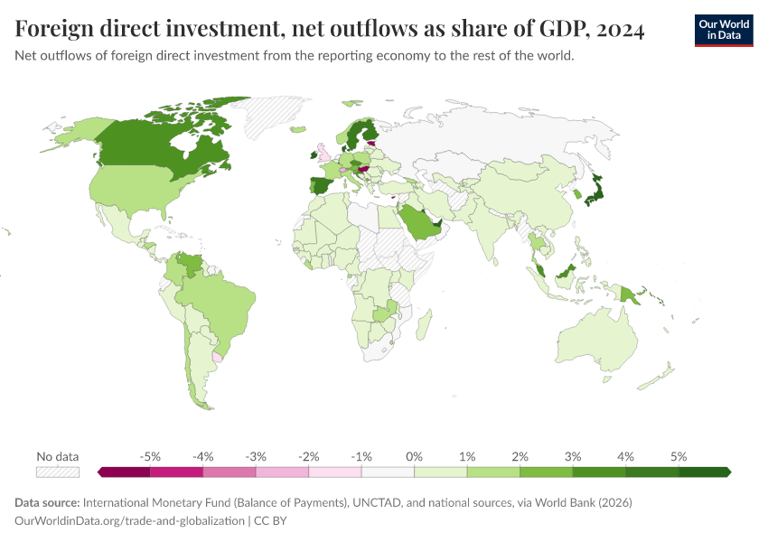 “Data Page: Foreign direct investment, net outflows as share of GDP”. Our World in Data (2026). Data adapted from International Monetary Fund (Balance of Payments), UNCTAD, and national sources, via World Bank. Retrieved from https://update-wdi-2026-02-27.owid.pages.dev:8789/20260202-181317/grapher/foreign-direct-investment-net-outflows-as-share-of-gdp.html [online resource] (archived on February 2, 2026).How to cite this data