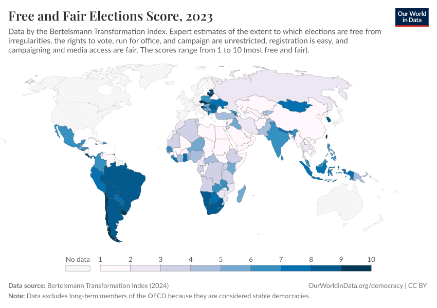 Bertelsmann Transformation Index (2024) – processed by Our World in Data. “Free and Fair Elections Score” [dataset]. Bertelsmann Transformation Index, “Bertelsmann Transformation Index, Scores” [original data]. Retrieved March 1, 2026 from https://update-wdi-2026-02-27.owid.pages.dev:8789/20260204-170225/grapher/free-fair-elections-bti.html (archived on February 4, 2026).