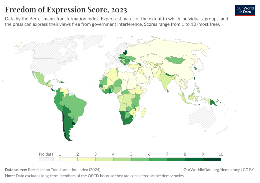 Bertelsmann Transformation Index (2024) – processed by Our World in Data. “Freedom of Expression Score” [dataset]. Bertelsmann Transformation Index, “Bertelsmann Transformation Index, Scores” [original data]. Retrieved March 1, 2026 from https://update-wdi-2026-02-27.owid.pages.dev:8789/20260204-165456/grapher/freedom-of-expression-score-bti.html (archived on February 4, 2026).