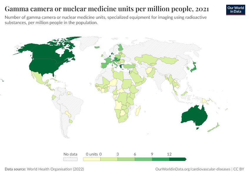 “Data Page: Gamma camera or nuclear medicine units per million people”, part of the following publication: Saloni Dattani, Veronika Samborska, Hannah Ritchie, and Max Roser (2023) - “Cardiovascular Diseases”. Data adapted from World Health Organisation. Retrieved from https://update-wdi-2026-02-27.owid.pages.dev:8789/20250909-093708/grapher/gamma-camera-or-nuclear-medicine-availability.html [online resource] (archived on September 9, 2025).How to cite this data