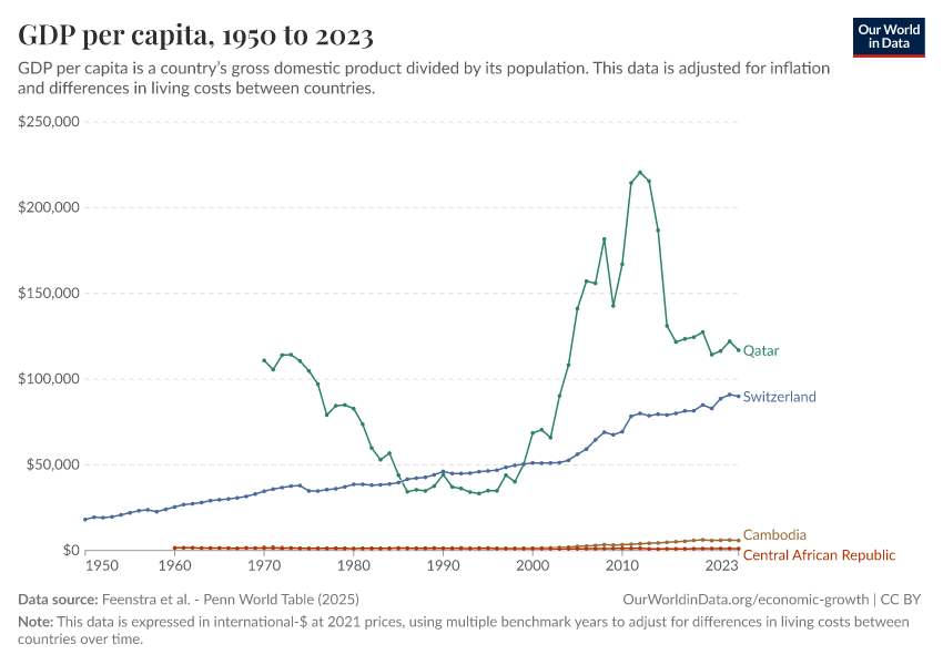 Feenstra et al. - Penn World Table (2025) – with major processing by Our World in Data. “GDP per capita – Penn World Table – In constant international-$” [dataset]. Feenstra et al., “Penn World Table 11.0” [original data]. Retrieved March 1, 2026 from https://update-wdi-2026-02-27.owid.pages.dev:8789/20251013-111729/grapher/gdp-per-capita-penn-world-table.html (archived on October 13, 2025).