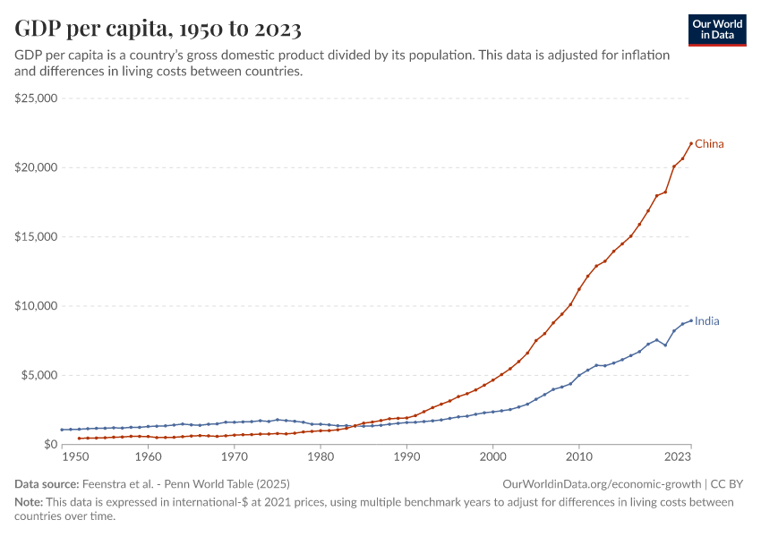 Feenstra et al. - Penn World Table (2025) – with major processing by Our World in Data. “GDP per capita – Penn World Table – In constant international-$” [dataset]. Feenstra et al., “Penn World Table 11.0” [original data]. Retrieved March 1, 2026 from https://update-wdi-2026-02-27.owid.pages.dev:8789/20251013-111729/grapher/gdp-per-capita-penn-world-table.html (archived on October 13, 2025).