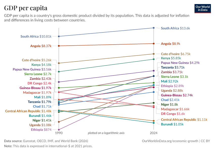 “Data Page: GDP per capita”, part of the following publication: Max Roser, Bertha Rohenkohl, Pablo Arriagada, Joe Hasell, Hannah Ritchie, and Esteban Ortiz-Ospina (2023) - “Economic Growth”. Data adapted from Eurostat, OECD, IMF, and World Bank. Retrieved from https://update-wdi-2026-02-27.owid.pages.dev:8789/20260202-180243/grapher/gdp-per-capita-worldbank.html [online resource] (archived on February 2, 2026).How to cite this data