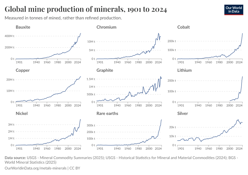 USGS - Mineral Commodity Summaries (2025); USGS - Historical Statistics for Mineral and Material Commodities (2024); BGS - World Mineral Statistics (2025) – with major processing by Our World in Data. “Global mine production of minerals” [dataset]. United States Geological Survey, “Mineral Commodity Summaries”; United States Geological Survey, “Historical Statistics for Mineral and Material Commodities”; British Geological Survey, “World Mineral Statistics” [original data]. Retrieved March 1, 2026 from https://update-wdi-2026-02-27.owid.pages.dev:8789/20260116-170644/grapher/global-mine-production-minerals.html (archived on January 16, 2026).