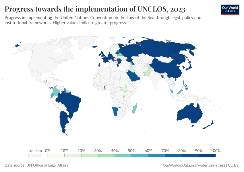 “Data Page: Progress towards the implementation of UNCLOS”. Our World in Data (2026). Data adapted from UN Office of Legal Affairs. Retrieved from https://update-wdi-2026-02-27.owid.pages.dev:8789/20251120-211749/grapher/implementation-of-unclos.html [online resource] (archived on November 20, 2025).How to cite this data