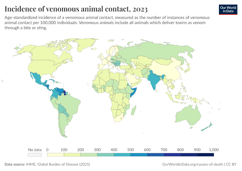 IHME, Global Burden of Disease (2025) – with major processing by Our World in Data. “Incidence of venomous animal contact” [dataset]. IHME, Global Burden of Disease, “Global Burden of Disease - Prevalence and Incidence” [original data]. Retrieved March 1, 2026 from https://update-wdi-2026-02-27.owid.pages.dev:8789/20260212-172132/grapher/incidence-of-venomous-animal-contact.html (archived on February 12, 2026).