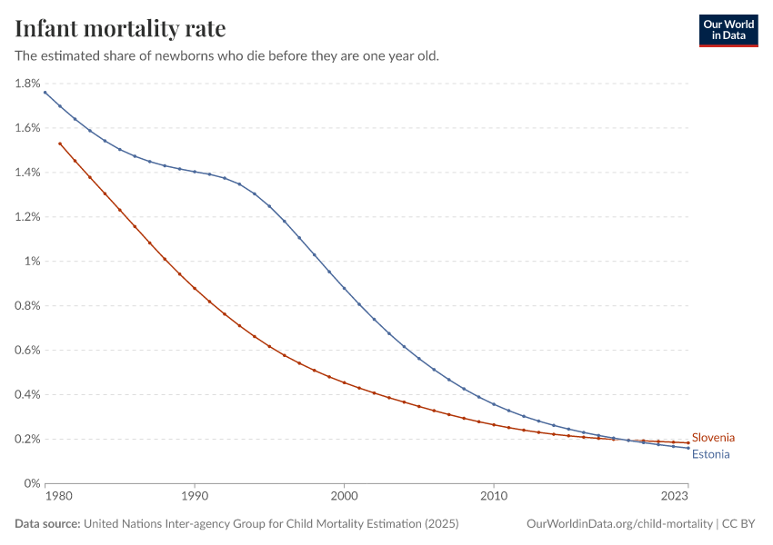 United Nations Inter-agency Group for Child Mortality Estimation (2025) – with minor processing by Our World in Data. “Infant mortality rate” [dataset]. United Nations Inter-agency Group for Child Mortality Estimation, “United Nations Inter-agency Group for Child Mortality Estimation”; Various sources, “Population” [original data]. Retrieved March 1, 2026 from https://update-wdi-2026-02-27.owid.pages.dev:8789/20260119-070102/grapher/infant-mortality.html (archived on January 19, 2026).