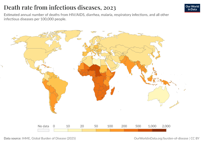 IHME, Global Burden of Disease (2025) – with major processing by Our World in Data. “Death rate from infectious diseases” [dataset]. IHME, Global Burden of Disease, “Global Burden of Disease - Deaths” [original data]. Retrieved March 1, 2026 from https://update-wdi-2026-02-27.owid.pages.dev:8789/20260211-174736/grapher/infectious-disease-death-rates-gbd.html (archived on February 11, 2026).