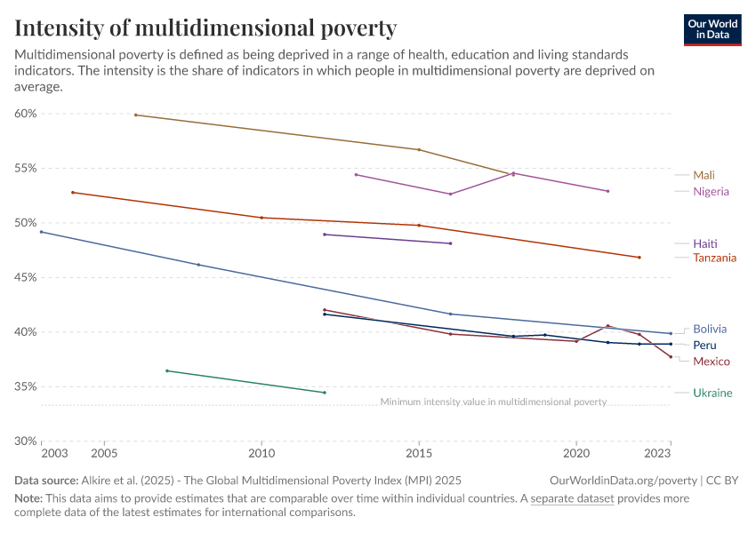 Alkire et al. (2025) - The Global Multidimensional Poverty Index (MPI) 2025 – with minor processing by Our World in Data. “Intensity of multidimensional poverty – Harmonized over time” [dataset]. Alkire et al., “Global Multidimensional Poverty Index (MPI) 2025” [original data]. Retrieved March 1, 2026 from https://update-wdi-2026-02-27.owid.pages.dev:8789/20251229-175603/grapher/intensity-of-multidimensional-poverty-hot.html (archived on December 29, 2025).