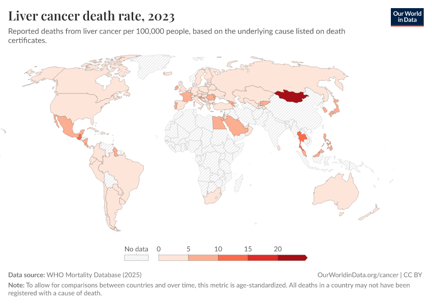 WHO Mortality Database (2025) – with minor processing by Our World in Data. “Liver cancer death rate” [dataset]. WHO Mortality Database, “WHO Mortality Database” [original data]. Retrieved March 1, 2026 from https://update-wdi-2026-02-27.owid.pages.dev:8789/20250909-093708/grapher/liver-cancer-death-rate.html (archived on September 9, 2025).