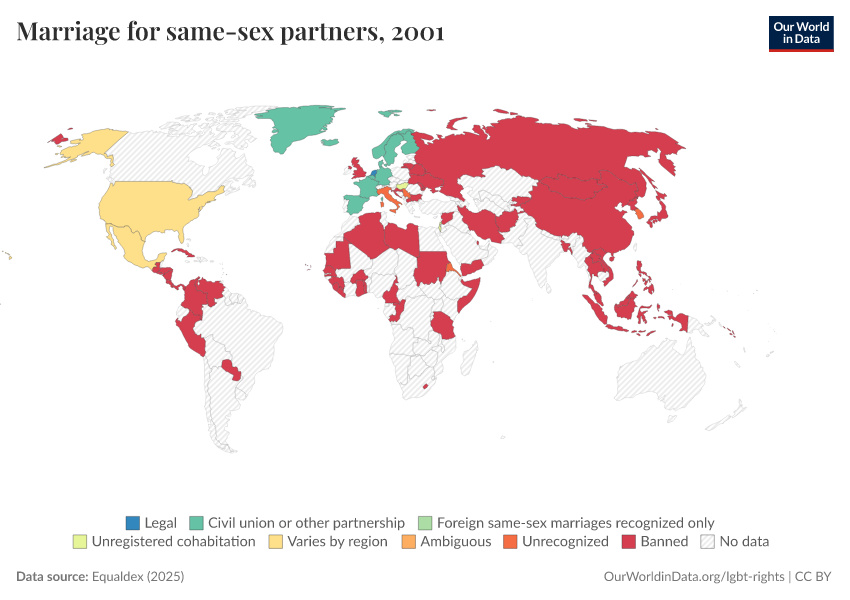“Data Page: Marriage for same-sex partners”, part of the following publication: Bastian Herre and Pablo Arriagada (2023) - “LGBT+ Rights”. Data adapted from Equaldex. Retrieved from https://update-wdi-2026-02-27.owid.pages.dev:8789/20250909-093708/grapher/marriage-same-sex-partners-equaldex.html [online resource] (archived on September 9, 2025).How to cite this data