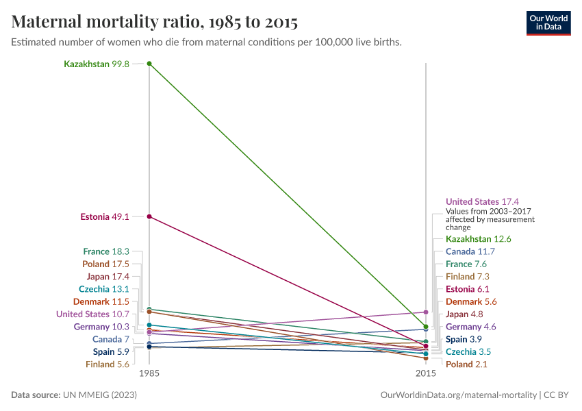 UN MMEIG (2023) – processed by Our World in Data. “Maternal mortality ratio” [dataset]. UN MMEIG (WHO, UNICEF, UNFPA, World Bank Group and UNDESA/ Population Division), “Trends in maternal mortality 2020” [original data]. Retrieved March 1, 2026 from https://update-wdi-2026-02-27.owid.pages.dev:8789/20260119-065148/grapher/maternal-mortality-slope-chart.html (archived on January 19, 2026).