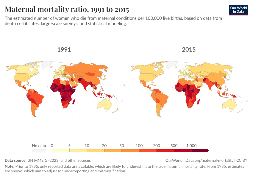 “Data Page: Maternal mortality ratio”, part of the following publication: Max Roser and Hannah Ritchie (2013) - “Maternal Mortality”. Data adapted from UN MMEIG (WHO, UNICEF, UNFPA, World Bank Group and UNDESA/ Population Division), WHO Mortality Database, United Nations, Gapminder. Retrieved from https://update-wdi-2026-02-27.owid.pages.dev:8789/20260119-065148/grapher/maternal-mortality.html [online resource] (archived on January 19, 2026).How to cite this data