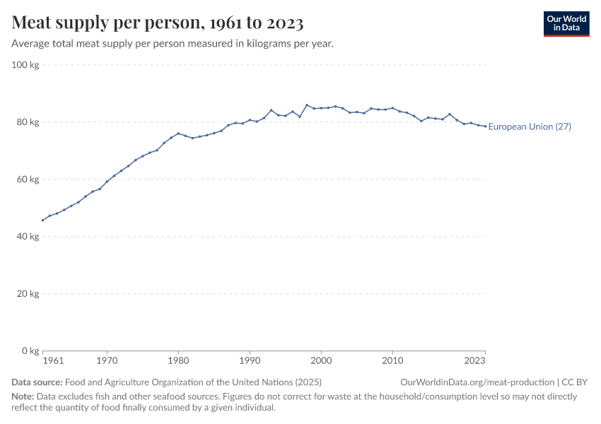 “Data Page: Yearly per capita supply of all meat”. Our World in Data (2026). Data adapted from Food and Agriculture Organization of the United Nations. Retrieved from https://update-wdi-2026-02-27.owid.pages.dev:8789/20260226-122020/grapher/meat-supply-per-person.html [online resource] (archived on February 26, 2026).