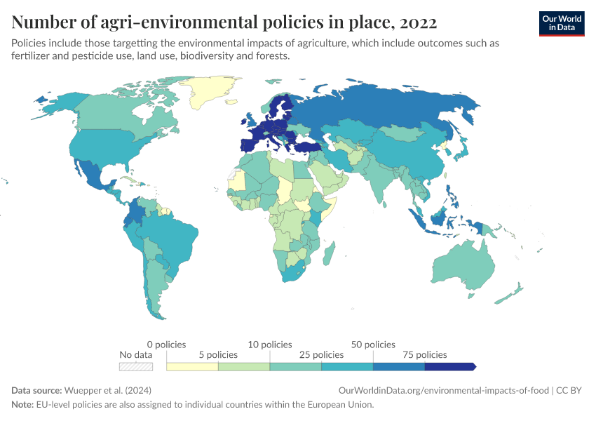 “Data Page: Number of agri-environmental policies in place”. Our World in Data (2026). Data adapted from Wuepper et al. (2024). Retrieved from https://update-wdi-2026-02-27.owid.pages.dev:8789/20250909-093708/grapher/number-agri-environmental-policies.html [online resource] (archived on September 9, 2025).How to cite this data