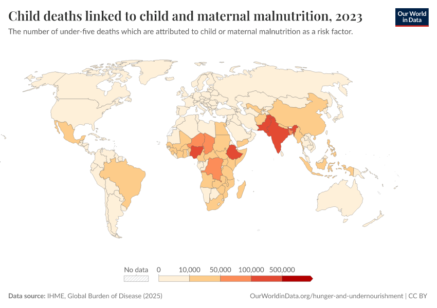 IHME, Global Burden of Disease (2025) – with major processing by Our World in Data. “Child deaths linked to child and maternal malnutrition” [dataset]. IHME, Global Burden of Disease, “Global Burden of Disease - Risk Factors - Deaths” [original data]. Retrieved March 1, 2026 from https://update-wdi-2026-02-27.owid.pages.dev:8789/20260213-112438/grapher/number-child-deaths-malnutrition.html (archived on February 13, 2026).