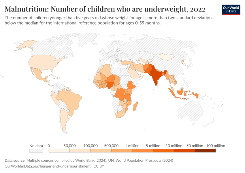 “Data Page: Number of underweight children”. Our World in Data (2026). Data adapted from UNICEF, WHO, World Bank, United Nations. Retrieved from https://update-wdi-2026-02-27.owid.pages.dev:8789/20260119-070102/grapher/number-of-children-who-are-underweight.html [online resource] (archived on January 19, 2026).How to cite this data