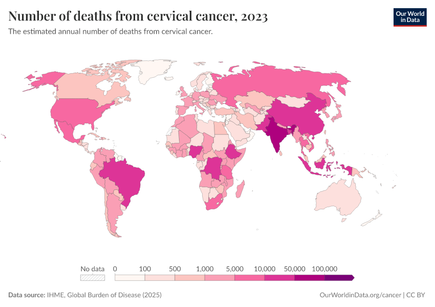 “Data Page: Number of deaths from cervical cancer”, part of the following publication: Esteban Ortiz-Ospina and Max Roser (2016) - “Global Health”. Data adapted from IHME, Global Burden of Disease. Retrieved from https://update-wdi-2026-02-27.owid.pages.dev:8789/20260211-174736/grapher/number-of-deaths-from-cervical-cancer.html [online resource] (archived on February 11, 2026).How to cite this data