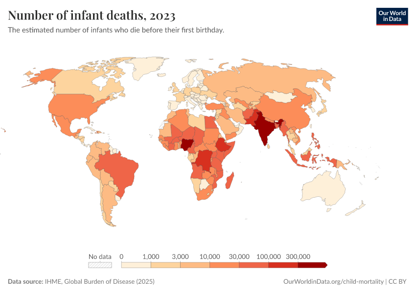 IHME, Global Burden of Disease (2025) – with minor processing by Our World in Data. “Number of infant deaths” [dataset]. IHME, Global Burden of Disease, “Global Burden of Disease - Child Mortality” [original data]. Retrieved March 1, 2026 from https://update-wdi-2026-02-27.owid.pages.dev:8789/20260213-140117/grapher/number-of-infant-deaths-ihme.html (archived on February 13, 2026).