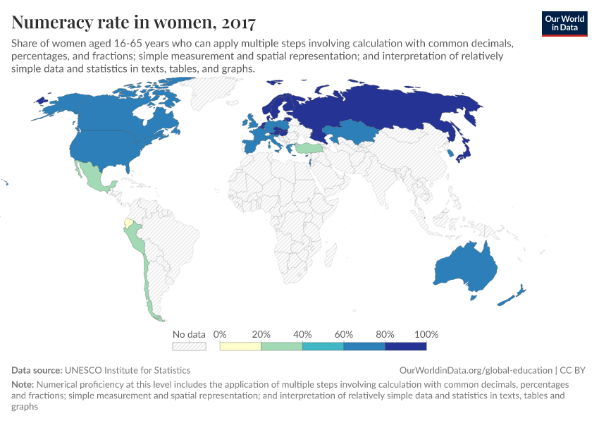 “Data Page: Numeracy rate in women”. Our World in Data (2026). Data adapted from UNESCO Institute for Statistics. Retrieved from https://update-wdi-2026-02-27.owid.pages.dev:8789/20260105-133053/grapher/numeracy-rate-in-adult-women-sdg.html [online resource] (archived on January 5, 2026).How to cite this data