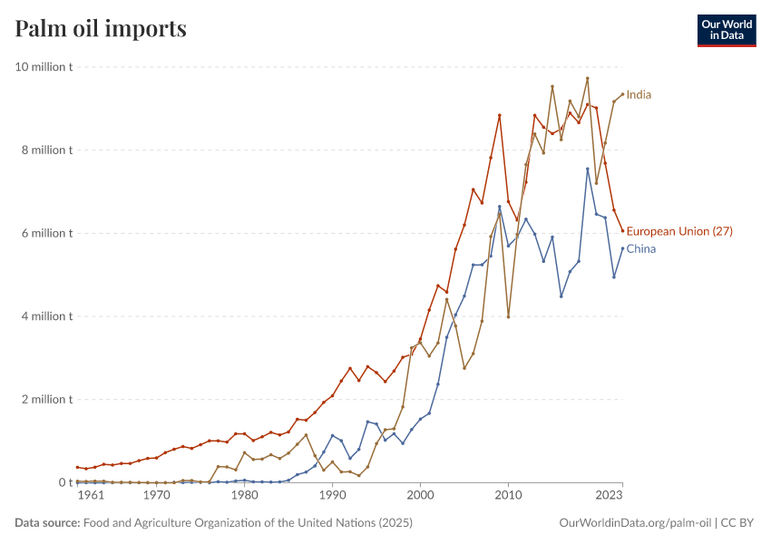 “Data Page: Imports of palm oil”. Our World in Data (2026). Data adapted from Food and Agriculture Organization of the United Nations. Retrieved from https://update-wdi-2026-02-27.owid.pages.dev:8789/20260226-122020/grapher/palm-oil-imports.html [online resource] (archived on February 26, 2026).How to cite this data