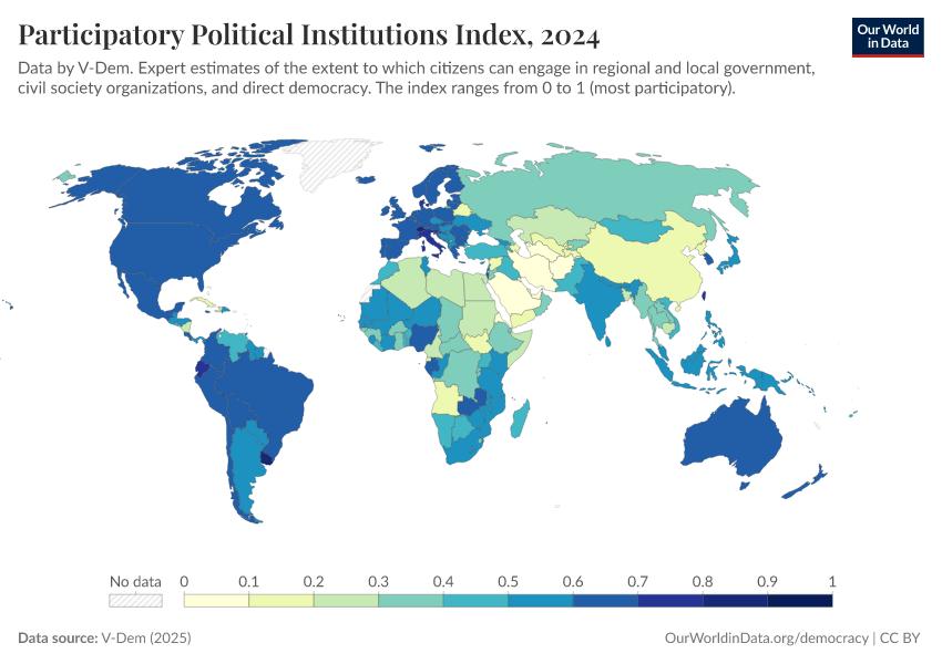 “Data Page: Participatory political institutions”, part of the following publication: Bastian Herre, Lucas Rodés-Guirao, and Esteban Ortiz-Ospina (2013) - “Democracy”. Data adapted from V-Dem. Retrieved from https://update-wdi-2026-02-27.owid.pages.dev:8789/20260119-070102/grapher/participatory-political-institutions-index.html [online resource] (archived on January 19, 2026).How to cite this data