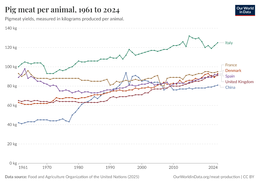 Food and Agriculture Organization of the United Nations (2025) – with major processing by Our World in Data. “Pig meat yield per animal – UN FAO” [dataset]. Food and Agriculture Organization of the United Nations, “Production: Crops and livestock products” [original data]. Retrieved March 1, 2026 from https://update-wdi-2026-02-27.owid.pages.dev:8789/20260226-122020/grapher/pig-yields-meat-per-animal-in-hectograms-100-grams.html (archived on February 26, 2026).