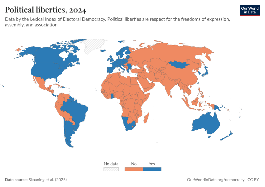 Skaaning et al. (2025) – processed by Our World in Data. “Political liberties” [dataset]. Skaaning et al., “Lexical Index of Electoral Democracy (LIED) v6.8” [original data]. Retrieved March 1, 2026 from https://update-wdi-2026-02-27.owid.pages.dev:8789/20260119-065148/grapher/political-liberties-lexical.html (archived on January 19, 2026).