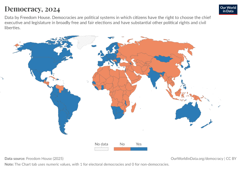 “Data Page: Democracy”, part of the following publication: Bastian Herre, Lucas Rodés-Guirao, and Esteban Ortiz-Ospina (2013) - “Democracy”. Data adapted from Freedom House. Retrieved from https://update-wdi-2026-02-27.owid.pages.dev:8789/20260119-070102/grapher/political-regime-dem-fh.html [online resource] (archived on January 19, 2026).How to cite this data