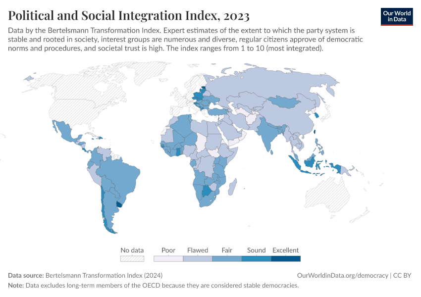 “Data Page: Political and Social Integration Index”, part of the following publication: Bastian Herre, Lucas Rodés-Guirao, and Esteban Ortiz-Ospina (2013) - “Democracy”. Data adapted from Bertelsmann Transformation Index. Retrieved from https://update-wdi-2026-02-27.owid.pages.dev:8789/20260105-133053/grapher/political-social-integration-index-bti.html [online resource] (archived on January 5, 2026).How to cite this data