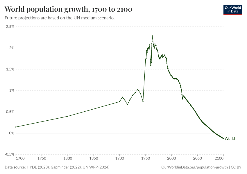 “Data Page: World population growth”, part of the following publication: Hannah Ritchie, Lucas Rodés-Guirao, Edouard Mathieu, Marcel Gerber, Esteban Ortiz-Ospina, Joe Hasell, and Max Roser (2023) - “Population Growth”. Data adapted from PBL Netherlands Environmental Assessment Agency, Gapminder, United Nations. Retrieved from https://update-wdi-2026-02-27.owid.pages.dev:8789/20260223-142202/grapher/population-growth-rate.html [online resource] (archived on February 23, 2026).How to cite this data