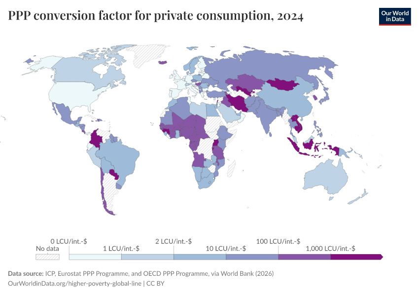“Data Page: PPP conversion factor for private consumption”. Our World in Data (2026). Data adapted from ICP, Eurostat PPP Programme, and OECD PPP Programme, via World Bank. Retrieved from https://update-wdi-2026-02-27.owid.pages.dev:8789/20260202-181317/grapher/ppp-conversion-factor-for-private-consumption.html [online resource] (archived on February 2, 2026).How to cite this data